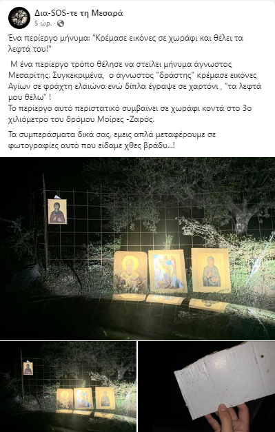 Σύμφωνα με το «Δια-SOS-τε τη Μεσαρά», ο άγνωστος «δράστης» κρέμασε εικόνες Αγίων σε φράχτη ελαιώνα, ενώ δίπλα έγραψε σε χαρτόνι, «τα λεφτά μου θέλω».
